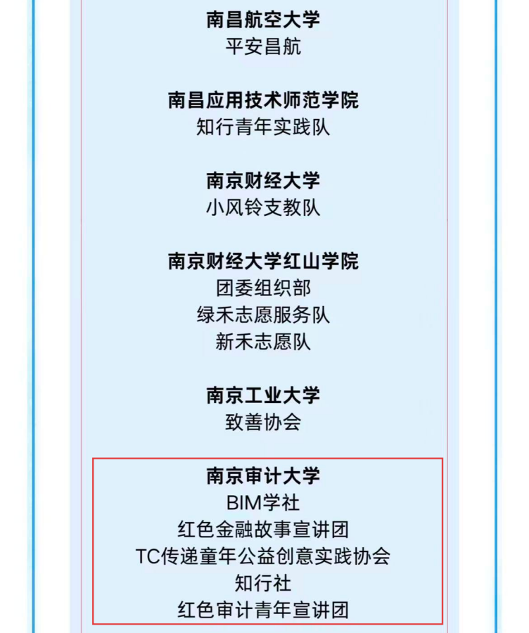 近日,中国大学生知行促进计划与青年影响力创新中心联合发布了2025年“榜样100”全国大学生优秀团队榜单(第二批),来自全国376所高校的1320支团队参与申报。经评审,我校五支团队入选,获评“榜样100”全国优秀大学生团队称号。入选团队包括:工程审计学院BIM学社、金融学院红色金融故事宣讲团、沁园书院TC传递童年公益创意实践协会、润园书院知行社、润园书院红色审计青年宣讲团(以上排名不分先后)