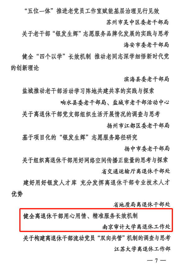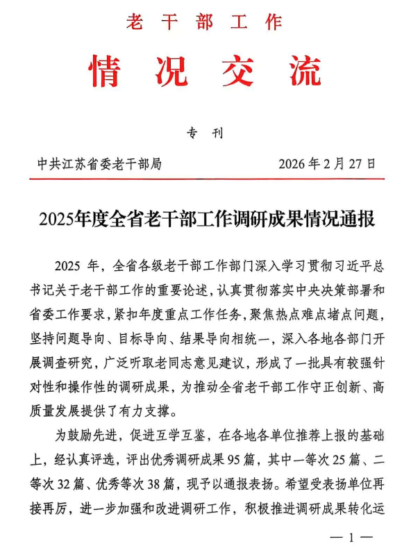 近日,中共江苏省委老干部局印发了《2025年度全省老干部工作调研成果情况通报》。其中,我校离退休工作处申报的调研成果《健全离退休干部用心用情、精准服务长效机制》获评“二等次”优秀调研成果。