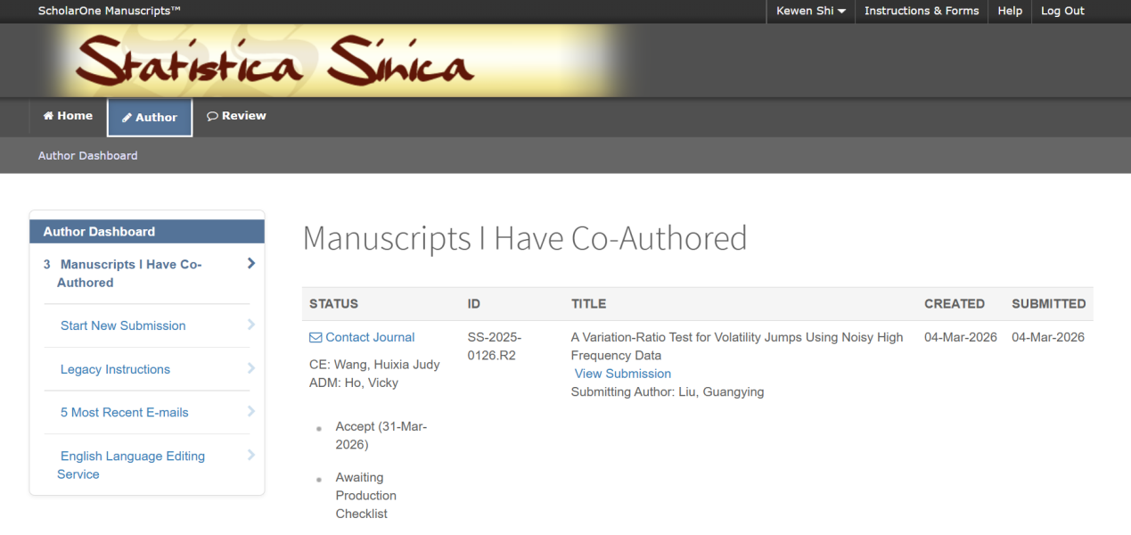 近日,我校统计与数据科学学院博士生施科文完成的学术论文“A Variation-Ratio Test for Volatility Jumps Using Noisy High Frequency Data”以南京审计大学为第一署名单位被统计学权威期刊Statistica Sinica接收。论文指导教师为我校统计与数据科学学院刘广应教授与上海财经大学张志远副教授。