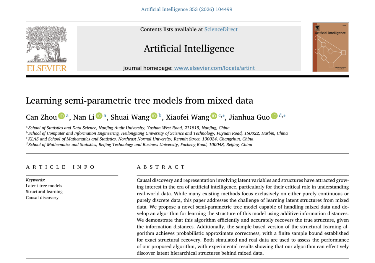 Can Zhou, Nan Li, Shuai Wang, Xiaofei Wang & Jianhua Guo (2026). Learning semi-parametric tree models from mixed data. Artificial Intelligence, 353, 1-25. https://doi.org/10.1016/j.artint.2026.104499.