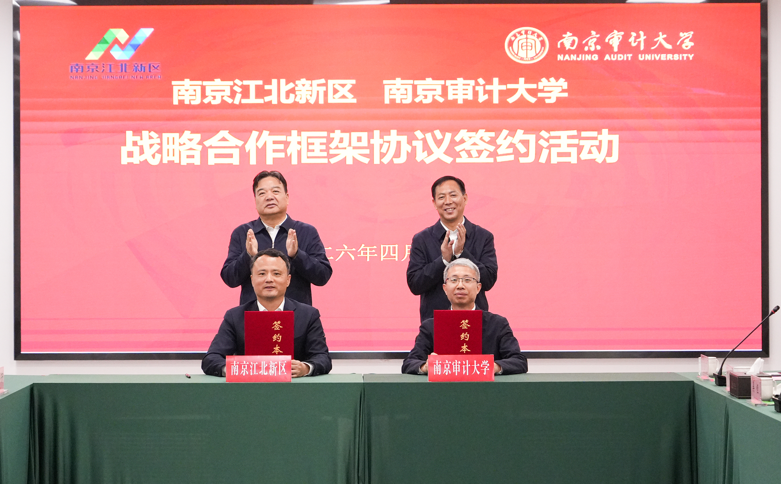 4月9日,南京江北新区与南京审计大学举行校地全面战略合作框架协议签约活动。江北新区党工委书记、浦口区委书记陆卫东,江北新区党工委委员、管委会副主任王伟,我校党委书记董必荣,党委副书记陈中建,党委常委、副校长姜海出席活动。