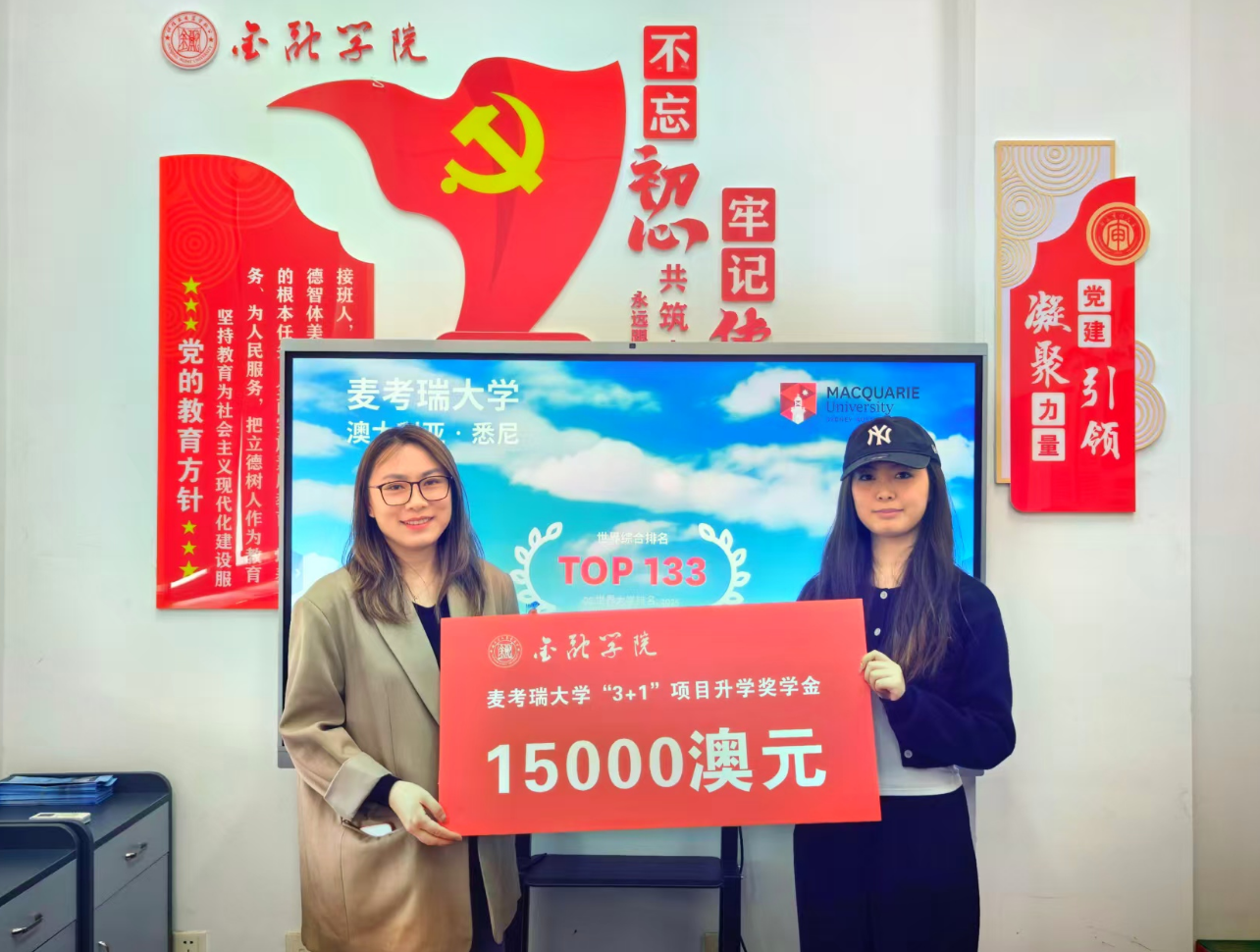 近日,我校金融学院徐予、杜婧璇、史可心、沙鑫博四名同学获得麦考瑞大学“3+1”硕士联合培养项目升学奖学金。该项目经学校批准,自2025年秋学期起,由金融学院与澳大利亚麦考瑞大学(Macquarie University)商学院合作开展,采用前三年完成本科阶段学习,第四年赴麦考瑞大学攻读硕士学位的培养模式,目前已有多名在校生参与。据悉,项目学生在正式入学前还有奖学金申请机会。